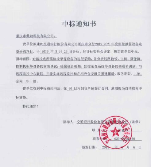 我公司中標(biāo):交行重慶市分行2019-2021年度監(jiān)控報(bào)警設(shè)備選型采購項(xiàng)目